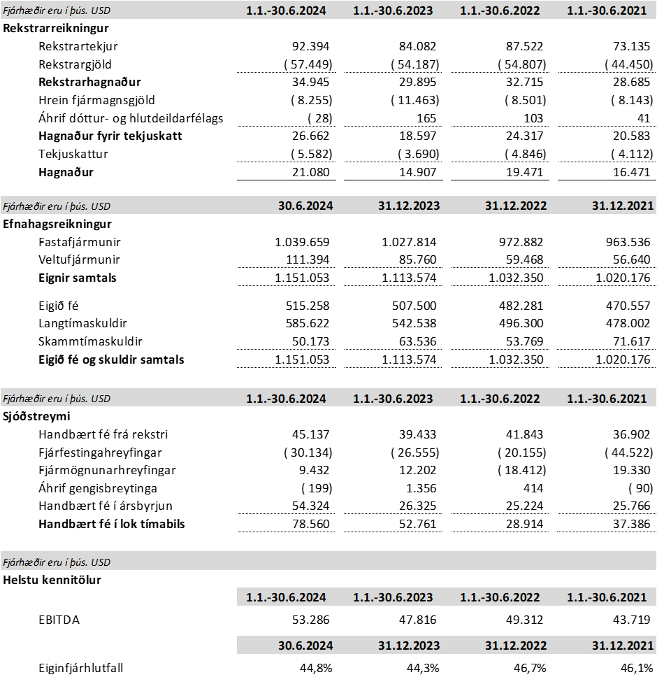 [1] Til viðmiðunar eru sýndar íslenskar krónur, notast var við meðaltal miðgengis Seðlabanka fyrir tímabilið USD/ISK 138,24 fyrir rekstrartölur en lokagengi miðgengis Seðlabanka þann 30. júní 2024 USD/ISK 139,09 fyrir efnahagstölur.